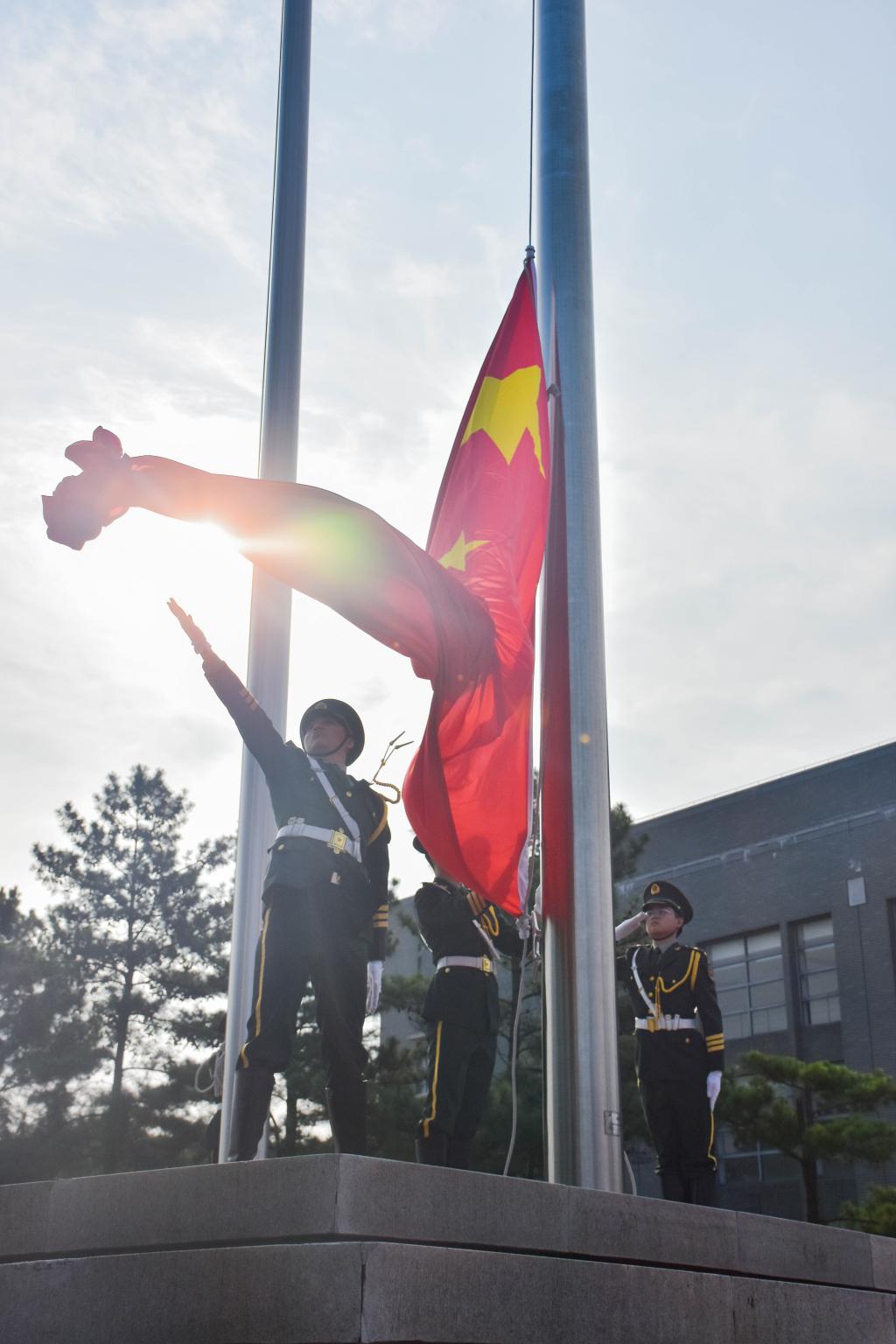 在莊嚴激昂的樂聲中,國旗護衛隊身著戎裝,邁著整齊的步伐,護送著五星紅旗走向升旗臺。全場師生懷著激動喜悅的心情,一同高唱國歌,注目凝望。在雄壯的國歌聲中,五星紅旗冉冉升起,迎風飄揚。