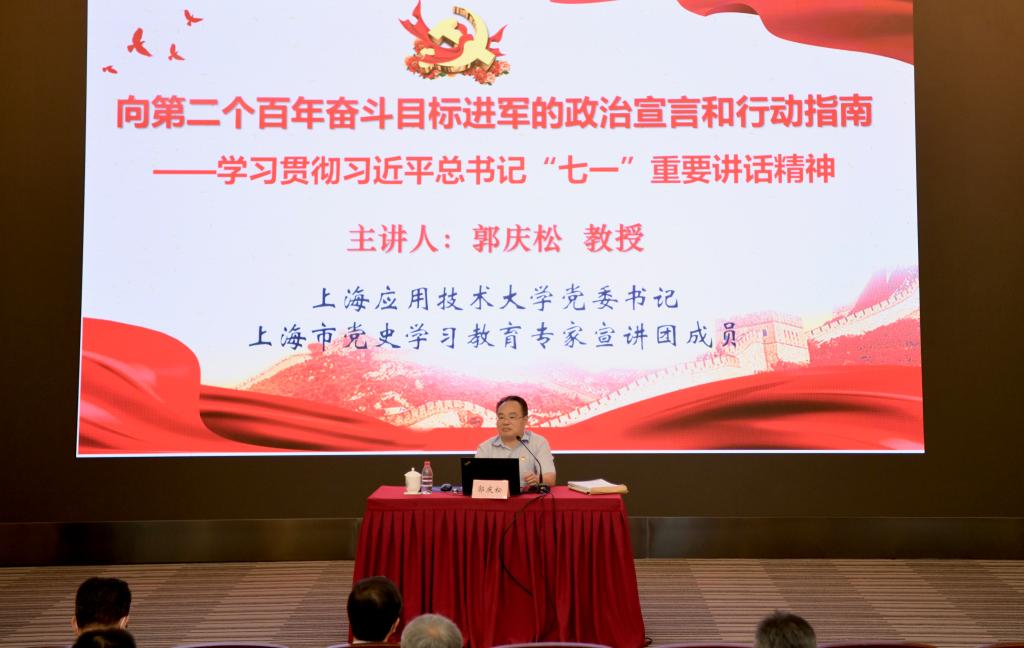 8月17日下午,學校舉行校黨委理論學習中心組擴大學習會,專題學習習近平總書記在慶祝中國共產黨成立100周年大會上的重要講話精神,邀請上海市黨史學習教育專家宣講團成員、上海應用技術大學黨委書記、上海市委黨校原副校長郭慶松教授作題為《向第二個百年奮斗目標進軍的政治宣言和行動指南——學習貫徹習近平總書記“七一”重要講話精神》的輔導報告。受在外參加重要會議的校黨委書記方守恩委托,校黨委副書記吳廣明主持學習會。校長陳杰等在校校領導和全體中層正職干部在逸夫樓主會場參會,中層副職、科級干部和部分青年教師分別在四平路校區和嘉定校區智慧教室集中線上參會。這次學習會既是黨史學習教育的一次重要學習安排,也是學校中層干部綜合治理能力提升專題研討班(第二期)的重要培訓內容。