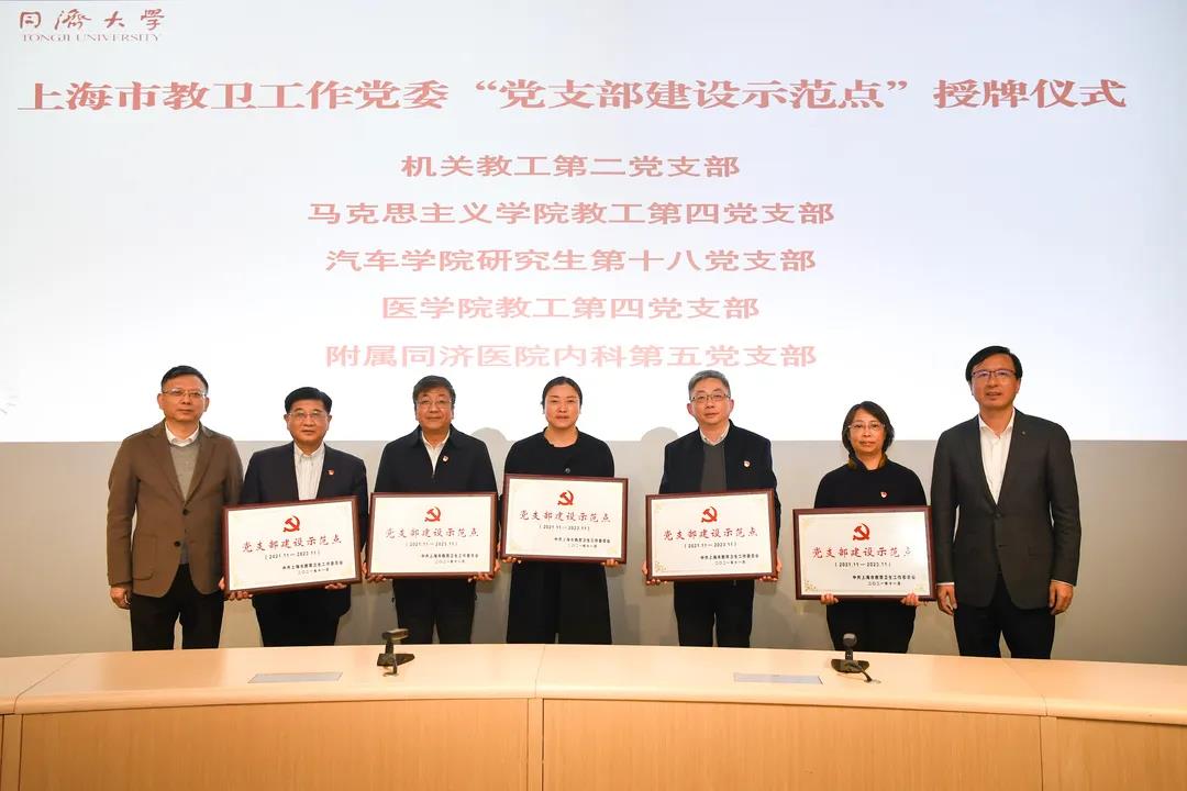 述職評議會前,學(xué)校還舉行了授牌儀式,為2021年獲得上海市、市教衛(wèi)工作黨委“黨支部建設(shè)示范點”的單位授牌,并為完成校內(nèi)“黨員之家”建設(shè)的單位進(jìn)行授牌。交通運輸工程學(xué)院教工第一黨支部榮獲上海市“黨支部建設(shè)示范點”,機關(guān)教工第二支部、馬克思主義學(xué)院教工第四支部、汽車學(xué)院研究生第十八支部、醫(yī)學(xué)院教工第四支部、附屬同濟(jì)醫(yī)院內(nèi)科第五支部等5個黨支部榮獲上海市教衛(wèi)工作黨委“黨支部建設(shè)示范點”,環(huán)境科學(xué)與工程學(xué)院黨委等27個單位建成“黨員之家”。