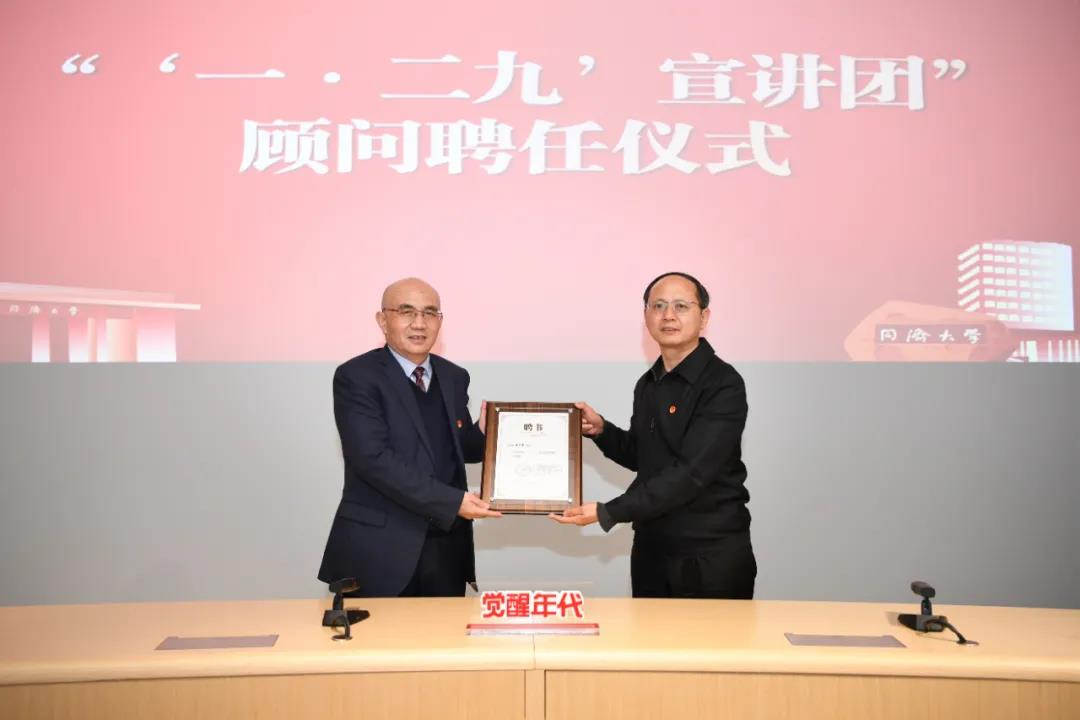當天,龍平平教授還受聘為同濟大學“一?二九宣講團”顧問。馮身洪向龍平平教授頒發聘書。2021年,在建黨百年之際,同濟大學學生會成立了“一?二九宣講團”,引導廣大青年了解校史校情,傳承紅色基因,賡續紅色血脈,弘揚愛國主義精神。