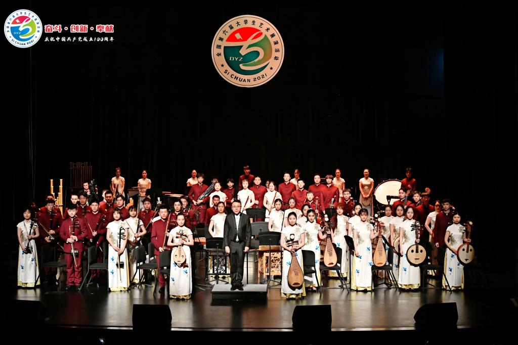 5月8日晚,我校學(xué)生民樂團參加全國大藝展民樂項目現(xiàn)場展演,精彩演繹民樂合奏《樓蘭意象》。同濟學(xué)子用民樂合奏《樓蘭意象》致敬燦爛中華文明,展現(xiàn)傳統(tǒng)音樂之美、多元文化之美,深植構(gòu)建“人類命運共同體”的理想。此次參演的60名學(xué)生來自19個學(xué)院,均為非藝術(shù)專業(yè)的學(xué)生,年級覆蓋從本科一年級到博士研究生二年級。自去年8月以來,民樂團的學(xué)生們不論是每周例行排練,還是法定節(jié)假日的集訓(xùn),都風(fēng)雨無阻,齊聚排練廳。本次赴蓉參賽,民樂團的全體成員更是參與到人員管理、樂器清點、后勤醫(yī)療等每一環(huán)節(jié)中,各有分工,做到人人有責(zé),人人參與,人人盡力,為比賽順利進行夯實基礎(chǔ)。