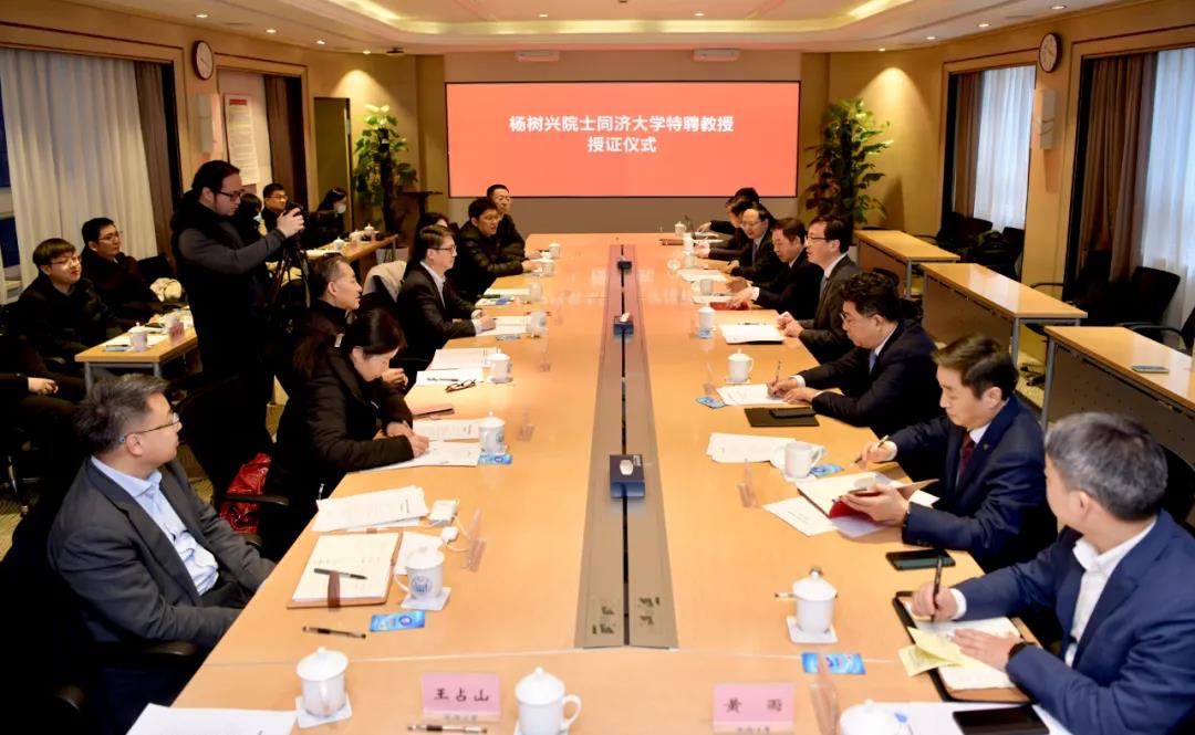 1月22日,楊樹興院士同濟大學特聘教授授證儀式在同濟大學四平路校區舉行。同濟大學校長陳杰為楊樹興院士頒發同濟大學特聘教授聘書,并為他佩戴同濟大學校徽。校黨委常務副書記馮身洪、常務副校長呂培明、副校長童小華出席,副校長黃翔峰主持授證儀式。學校相關職能部門負責人,航空航天與力學學院班子成員及教師代表參加儀式。會上,馮身洪宣讀了同濟大學聘任楊樹興院士為航空航天與力學學院院長的決定。