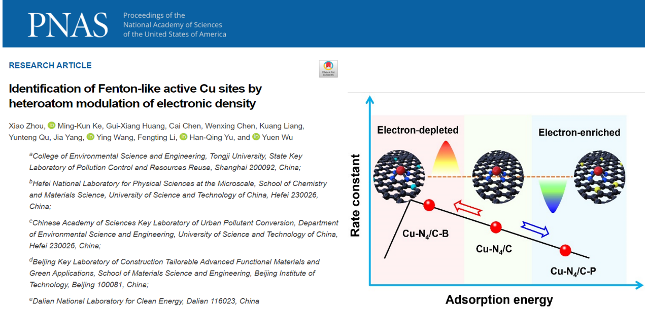 近日,我校環(huán)境科學(xué)與工程學(xué)院王穎教授團隊聯(lián)合中國科學(xué)技術(shù)大學(xué)研究團隊在國際權(quán)威刊物《美國科學(xué)院院報》(PNAS)上發(fā)表了題為“Identification of Fenton-like active Cu sites by heteroatom modulation of electronic density”的研究論文。通過在碳基底中引入缺電子的硼元素(B)或富電子的磷元素(P),系統(tǒng)調(diào)節(jié)了Cu中心的電子密度,并研究了其對活化PMS降解雙酚A(PBA)的反應(yīng)動力學(xué)的影響。其中,Cu-N4/C-B材料具有最佳的催化氧化能力,優(yōu)于絕大部分非均相類芬頓催化劑。該項研究工作為單原子金屬中心的電子結(jié)構(gòu)調(diào)控和原子水平上的構(gòu)效關(guān)系提供了深入見解。