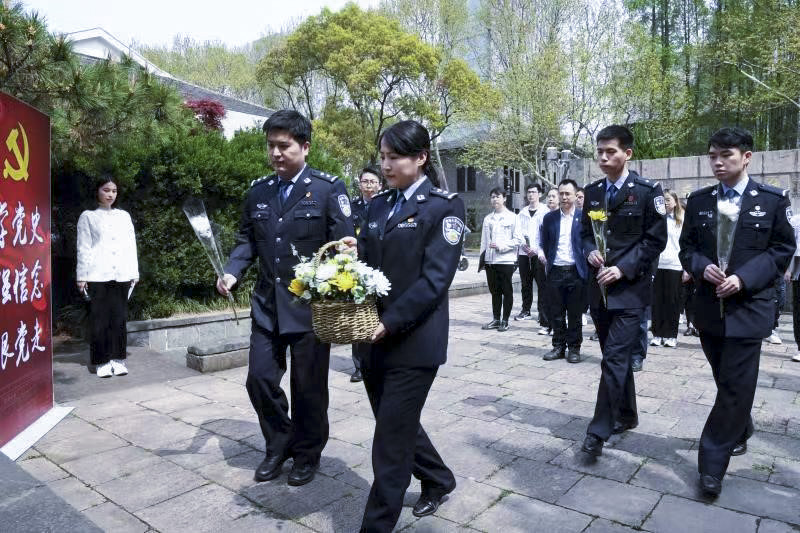 愛國學生運動紀念園內,本屆殷夫班學員代表以情景式朗誦致敬先烈,生動演繹了殷夫、尹景伊與劉宗歆三位烈士在面對國破家亡、山河飄零時的革命決心、愛國熱忱與視死如歸的獻身精神,表達學員們時刻銘記歷史、堅定愛國情懷、用不懈奮斗傳承烈士們理想信念的決心。隨后,滬東高校派出所的六位民警同志同殷夫班全體學員集體默哀并向烈士獻花。