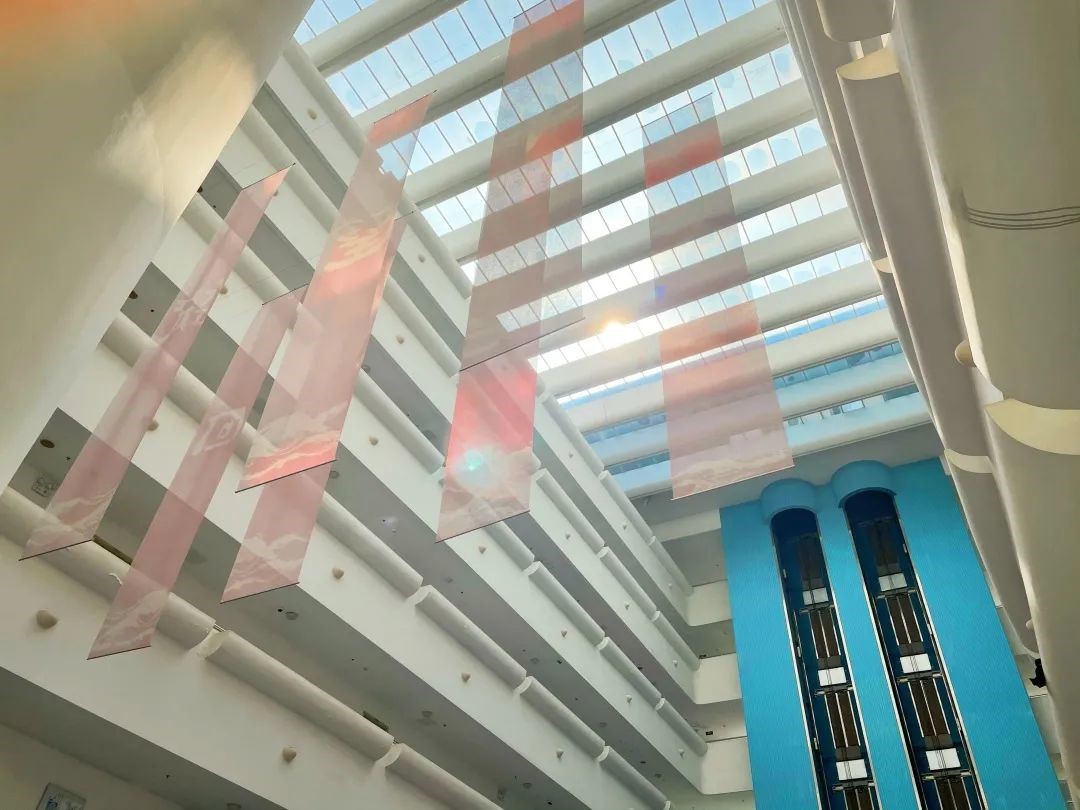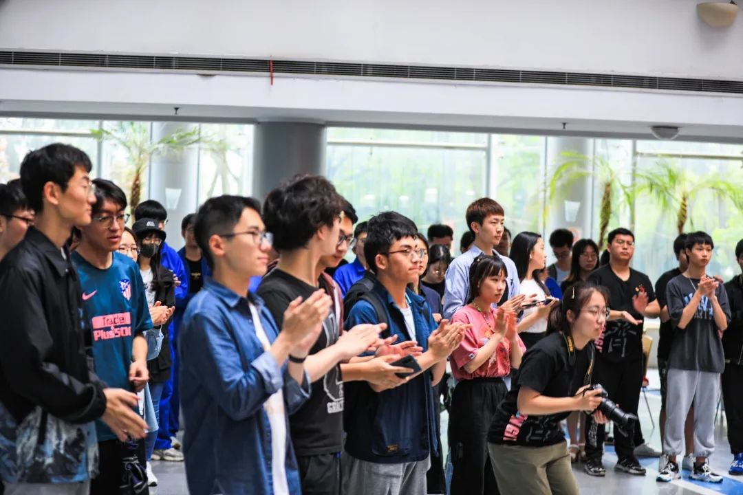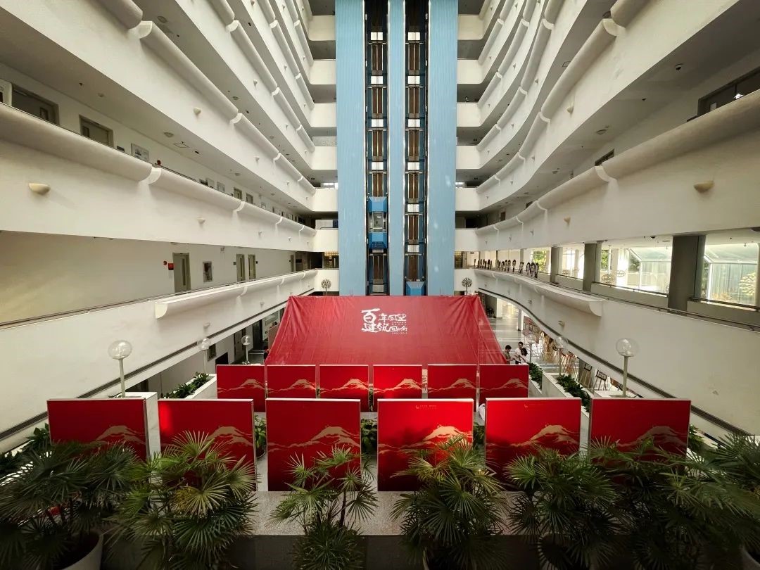 隨后,師生們沿著“崎嶇道路”紋樣的地貼動線拾級而上一同參觀了主題展,寓意重走革命道路,感悟黨初創時期的艱辛,勉勵大家帶著奮進的腳步走出最美的中國道路。在瑞安樓的中庭空間里,紅色與藍色的撞擊寓意著歷史與未來的交匯、傳統與現代的融合。展覽的丹砂朱紅底色象征著奮進新時代的精氣神,建筑線描繪出百年征程的奮進與實績。師生們紛紛表示,此次主題展有顏值、有內涵,能看、能聽且走心。